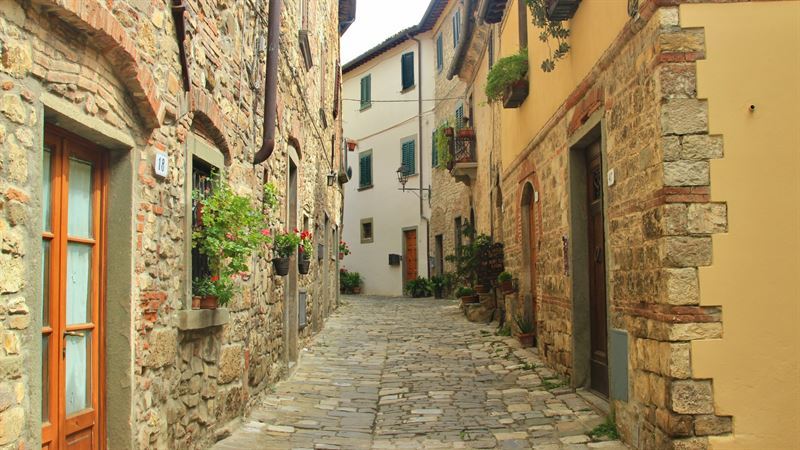 Montefioralle is located between Florence and Siena, set above Greve in Chianti and considered one of Tuscany's most beautiful villages. The town dates to 1085, still protected by its original defensive walls, and retains its circular street plan. Thanks to the town being almost completely car-free, visitors can peacefully wander the cobbled streets and visit the church of Saint Stefano, or relax and enjoy a glass of Chianti Classico. Just beyond the walls, scenic walks through vineyards and olive groves offer breathtaking views, with Montefioralle's stone houses providing a striking backdrop.