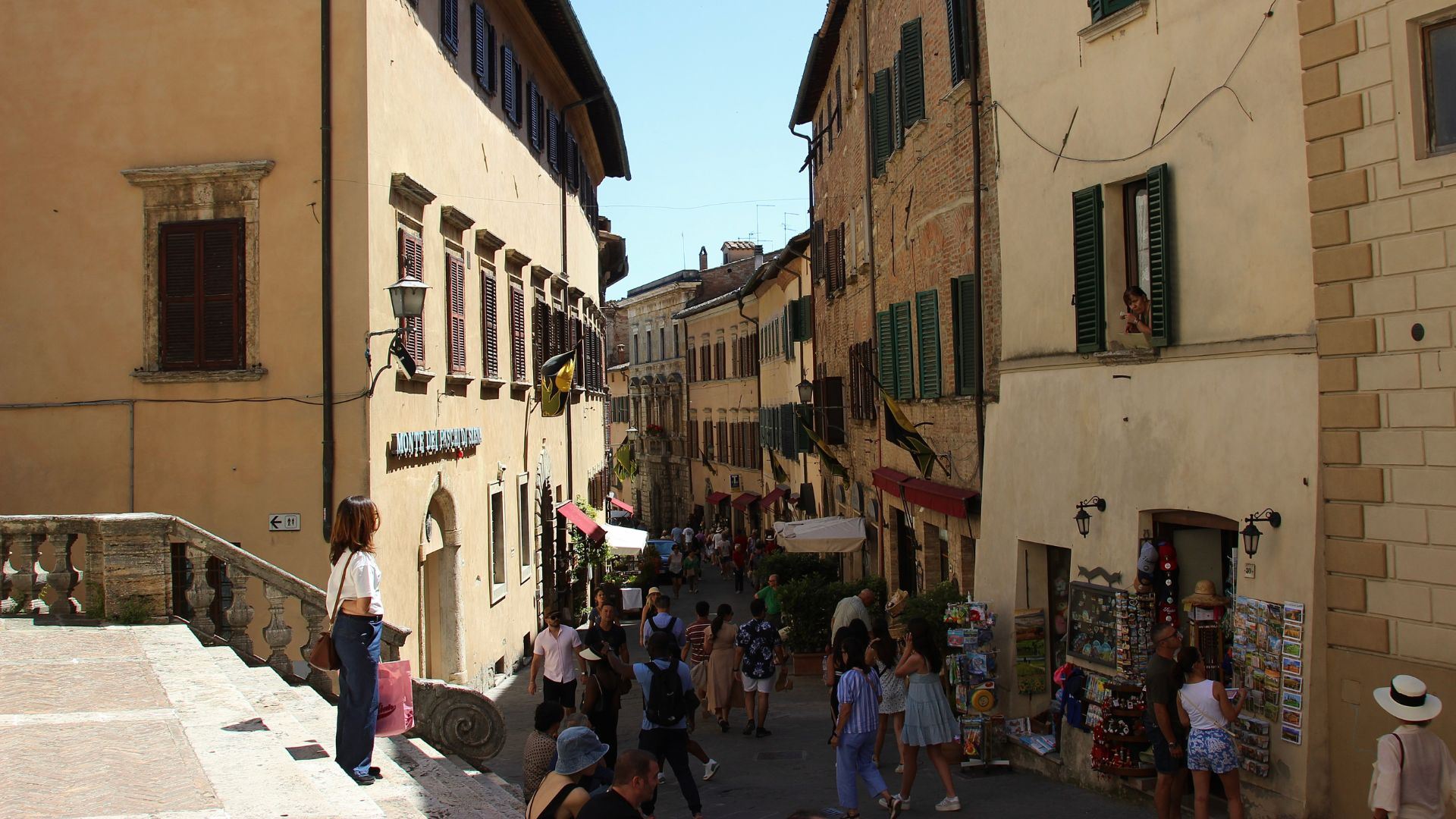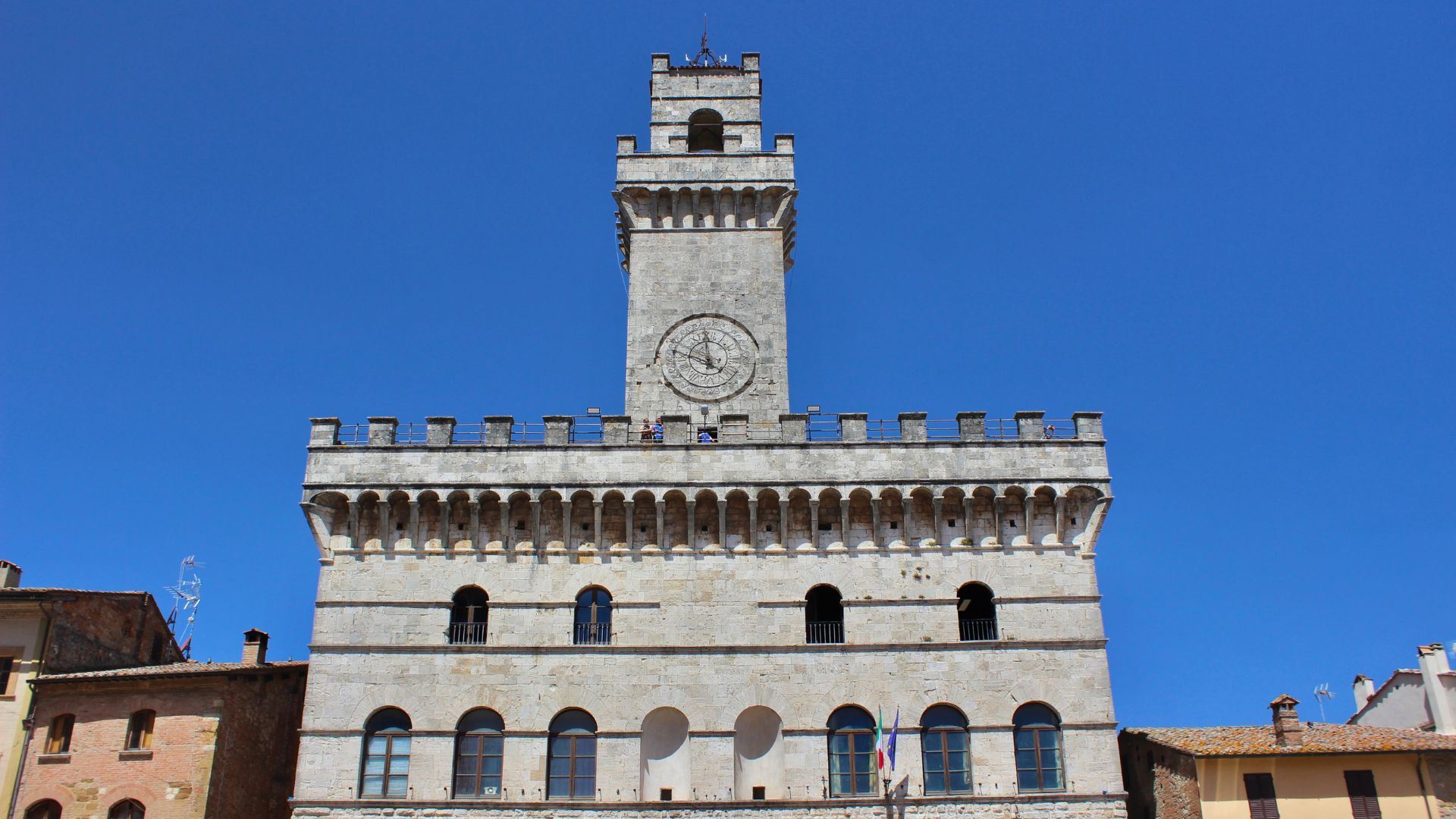 On one side is the 15th-century Palazzo Comunale (Town Hall), a miniature version of the Palazzo Vecchio in Florence.