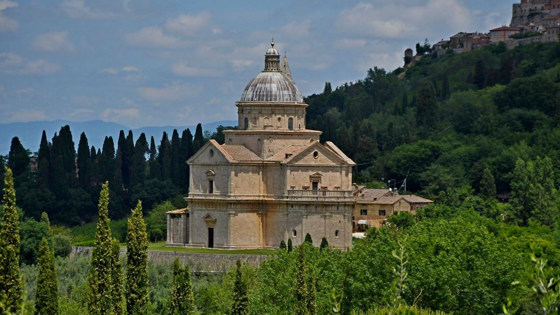 Just below Montepulciano’s city walls, at the end of a long line of cypresses, lies San Biagio, the Renaissance church most at ease with its setting. Designed by Antonio Sangallo, this domed masterpiece was begun in 1518. It’s an eye-catching sight, the honey-coloured travertine, matched by a perfect dome and great purity of line. The airy interior feels deeply classical, closer in spirit to the Pantheon in Rome than to a small Tuscan church. Sangallo’s bold design skills rival Bramante’s, not just in the church but elsewhere in the city, from elegant stone wells to porticoes.