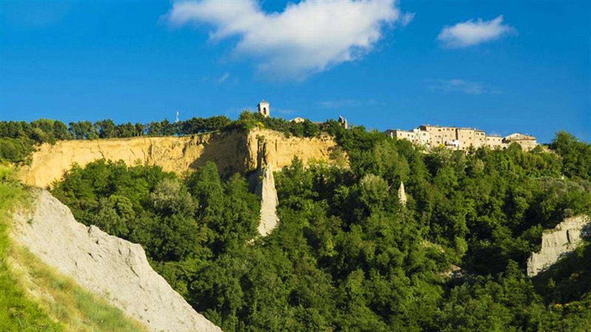 The countryside around Volterra is one of gentle, undulating hills, interrupted in the west by the wild and awe-inspiring spectacle of abrupt crevasses known as Le Balze, “the Crags”. Over the centuries, these deep gullies, created by the continual erosion of layers of sand and clay, have swallowed up fortifications, churches and settlements. The Etruscan walls that once stood here were casualties of a landslide, as were early Christian tombs. Today an 11th-century abbey, the Badia, sits on a precipice, awaiting its inevitable fate. For the perfect view of this dramatic landscape, exit through the western San Francesco Gate, passing the Borgo San Giusto until you reach Le Balze (a 20-minute walk).